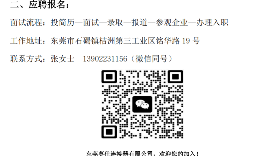 东莞莫仕连接器有限公司是美国Molex集团在中国设立的第一家生产基地,注册资本2.28亿港币,拥有员工4000多人。作为全球电子行业领导者,公司主要生产电子、电力、光纤连接器和系统,产品广泛应用于高端通讯、数据中心、家电、汽车、医疗、工业等领域,在业内享有极高的声誉。