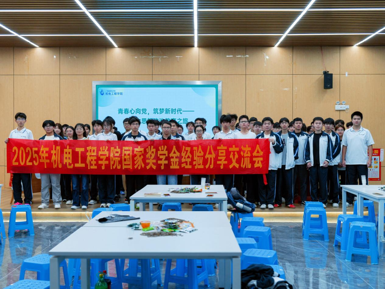 2025 年 11 月 17 日晚,机电工程学院 2025 年秋季国家奖学金分享交流会在建工机电楼 B 栋小广场举行。学院资助站李维、邱雪萍两位老师,4 名 2025 年度国家奖学金获得者,以及 2024级、2025级80余名学生参会。活动以“经验分享 + 互动交流”为核心形式,旨在传递优秀学子成长经验,激发学生学业进取与生涯规划主动性。