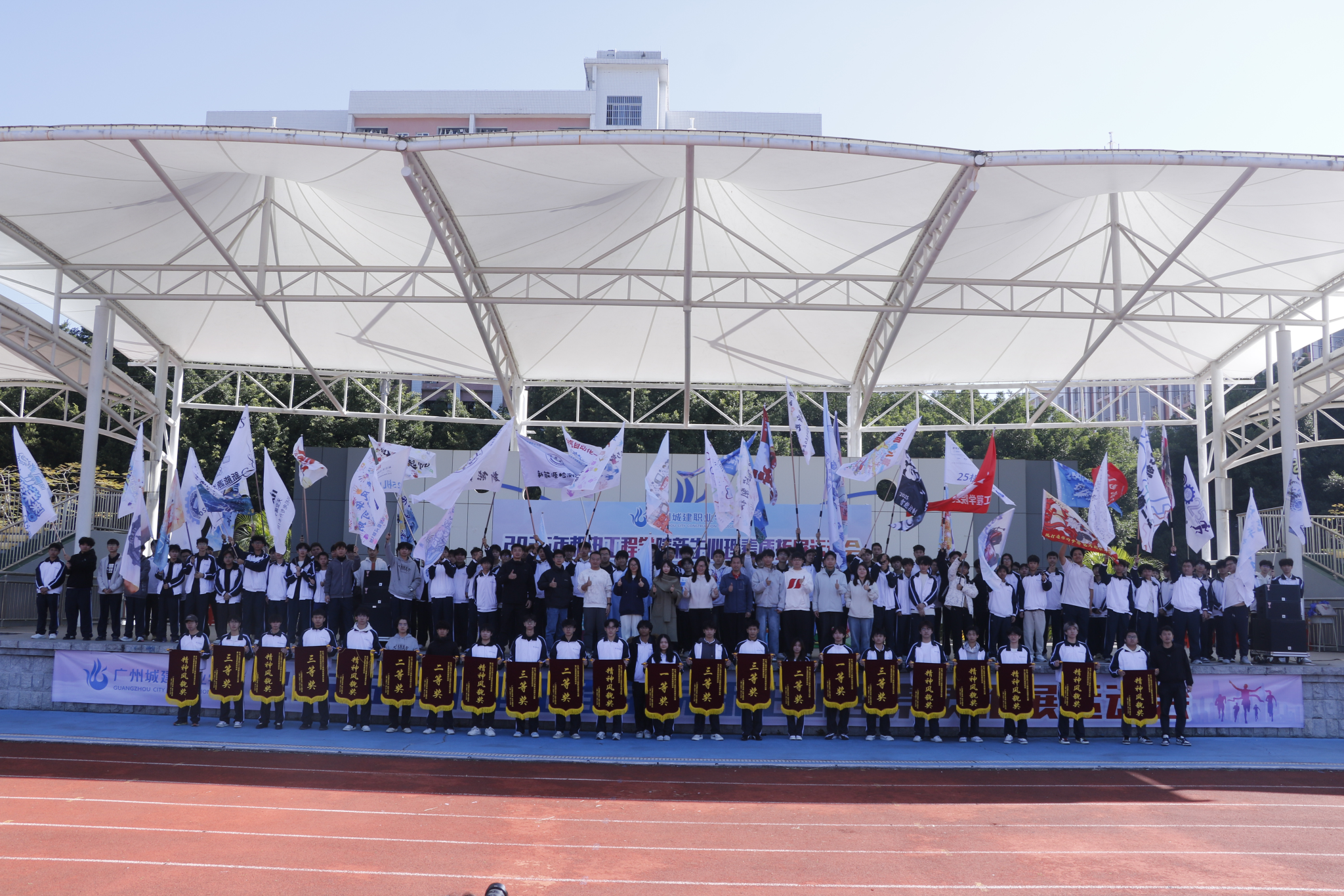 在班级文化展示环节,各新生班级依次登台,通过班旗设计、口号演绎、情景剧、歌舞、朗诵等多种形式,充分展现了班级特色与青春风采。有的班级结合专业特色编排创意节目;有的班级则用深情的合唱和动感舞蹈,表达了对未来的憧憬与集体的热爱。现场掌声不断,气氛热烈。经过评委综合评分,最终评选出一等奖2个班级、二等奖4个班级、三等奖6个班级、精神风貌奖10个班级。