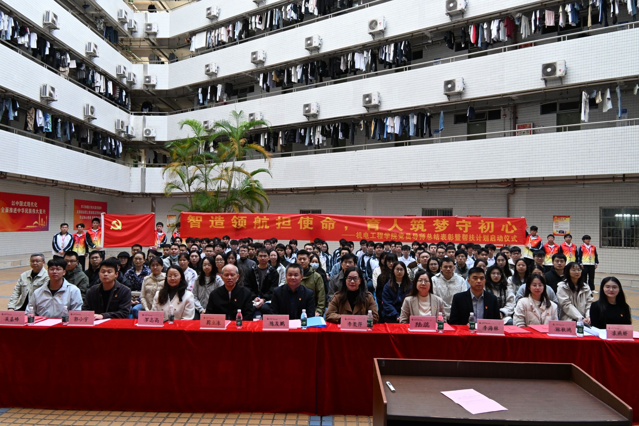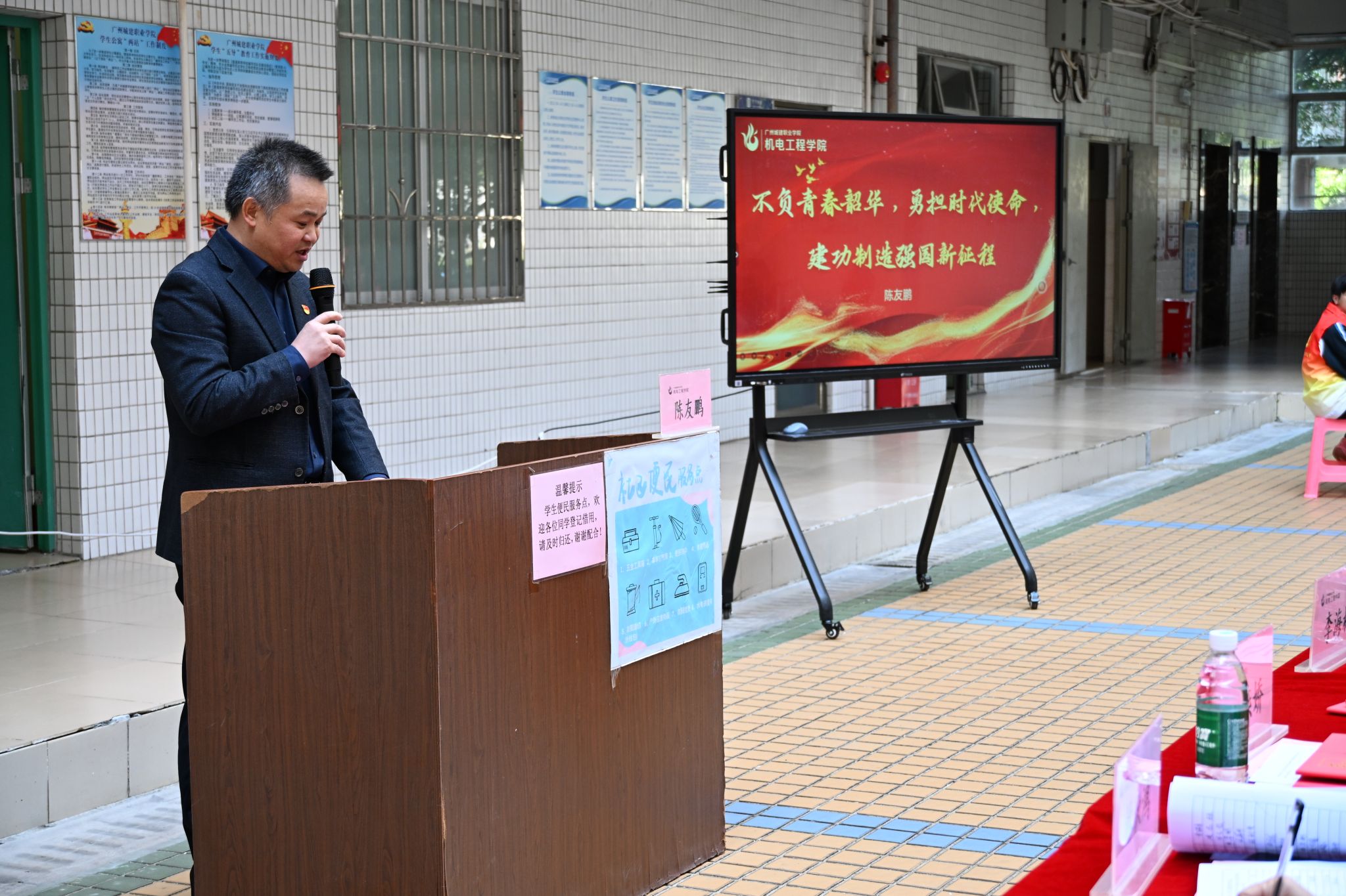 学院党委书记、院长陈友鹏发表讲话。他首先对出席活动的嘉宾、受表彰的优秀导师及新任导师表示诚挚问候与衷心祝贺。结合当前新一轮科技革命和产业变革趋势,以及“中国制造2025”战略与广东省相关行动方案要求,陈友鹏强调,机电工程学院作为培养智能制造专业人才的重要阵地,必须紧扣产业需求,深化人才培养模式改革。他对党员导师、辅导员及学生分别提出期望:党员导师要做好学生思想的引路人、学业的指导者与成长的护航员;辅导员要当好“智造”理念传播者、学业规划辅助者、帮扶互动协调者与班风学风建设者;学生要立鸿鹄志、练真本领、守工匠心、强健体魄,争做制造强国的追梦人、智能制造的生力军。陈友鹏表示,党员导师智造领航帮扶计划是学院落实立德树人根本任务、服务国家战略的重要载体,希望全体师生协同发力、锐意进取,以“智造”领航方向,为推动学院高质量发展、助力国家高质量发展贡献机电力量。