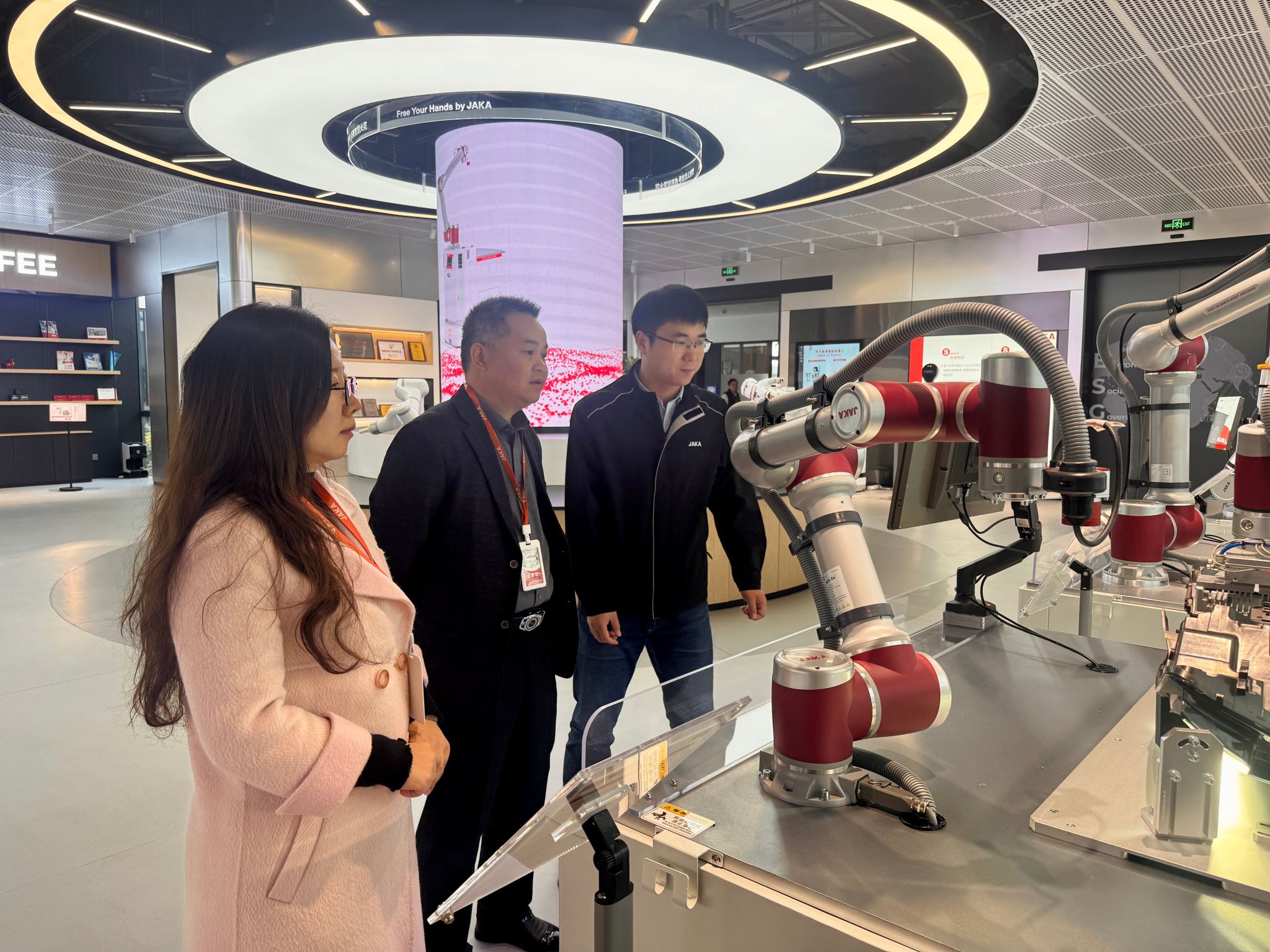 陈友鹏院长一行实地参观了节卡机器人企业展示大厅及机器人测试车间,详细了解了其技术实力与产品研发创新水平,对企业在机器人感知、运动控制等核心技术领域的突破表示赞赏。